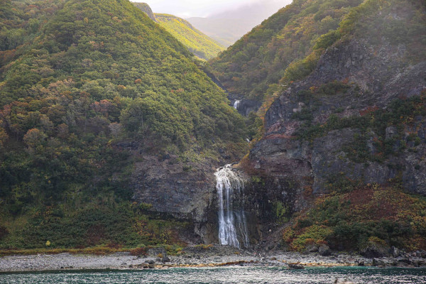 船の上から見たカムイワッカ湯の滝