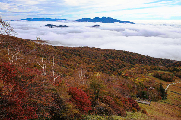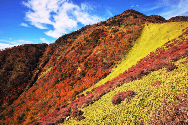 赤薙山。緑の草地、紅葉と青空のコントラストがいいです。