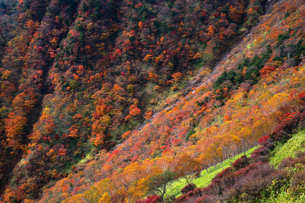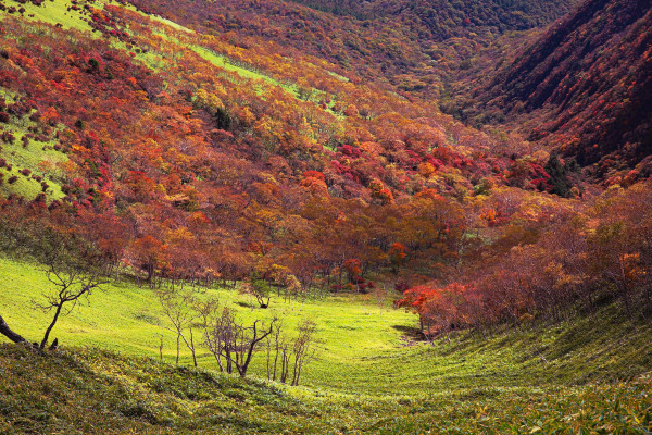 太陽が照ると、緑色の草地が明るくなり、紅葉の色が映えます。