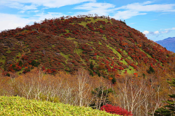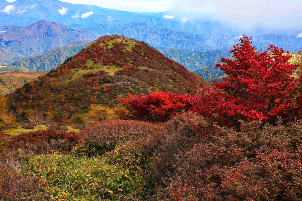 小丸山、赤、オレンジ色、黄色のパッチワークのような紅葉は安達太良山に匹敵します。